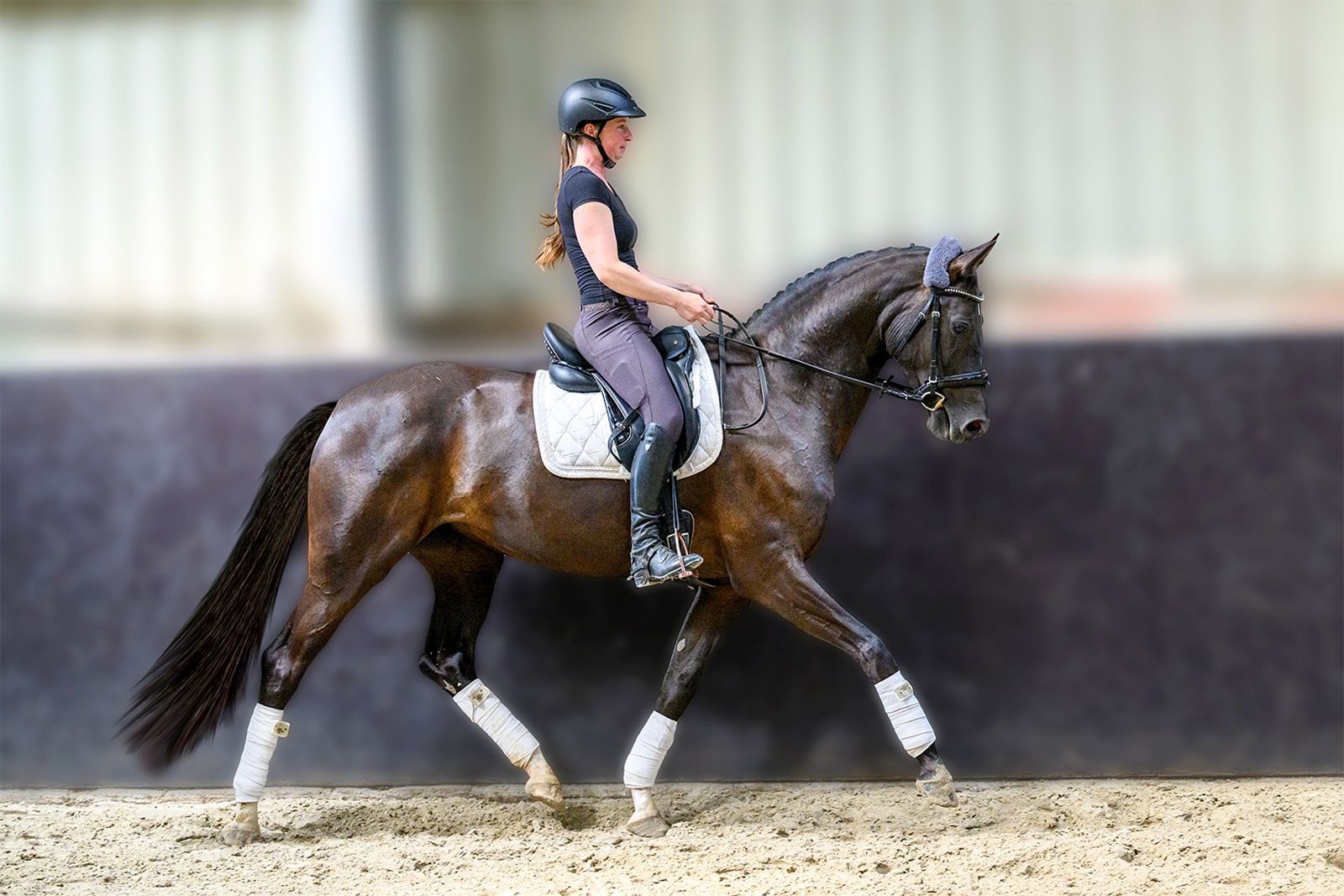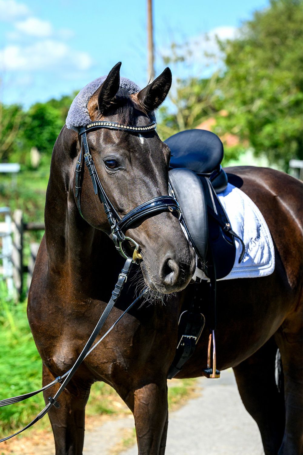 The black-brown daughter of the champion stallion Feinrich captivates with her flawless, charming appearance, her boundless willingness to perform, and her impeccable, people-oriented character. In line with her great potential, she has been carefully and gently trained by us up to Class A lessons. Gräfin ST, as we have named her, also shows talent, courage, and overview when jumping.