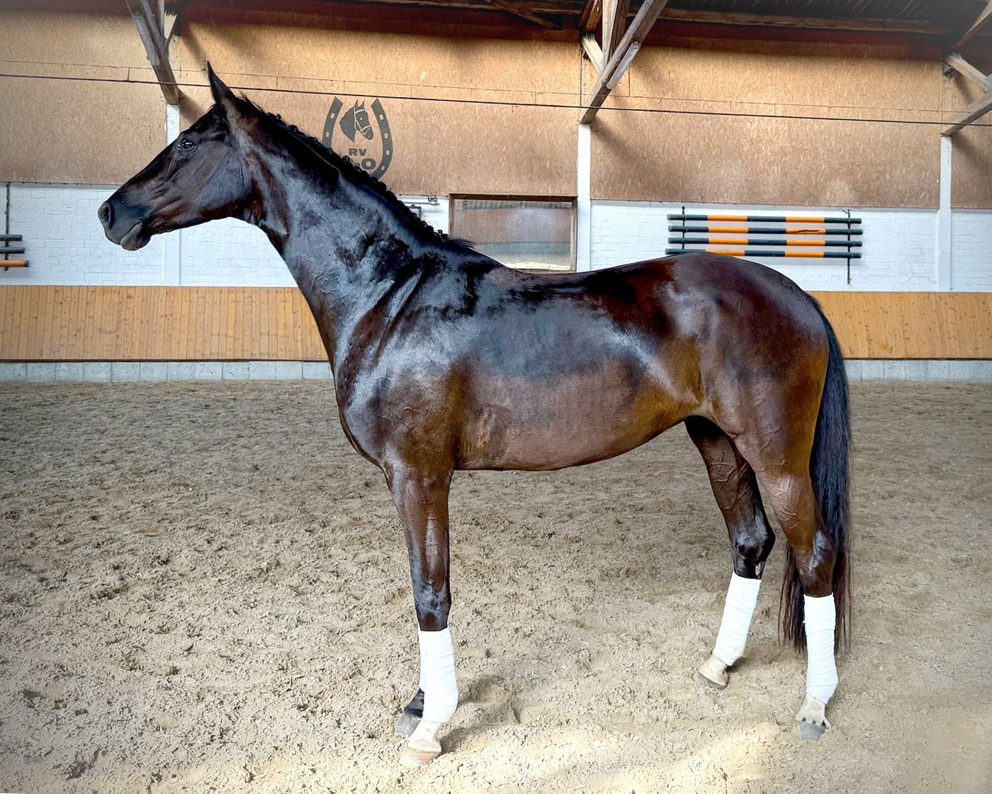 The black-brown daughter of the champion stallion Feinrich captivates with her flawless, charming appearance, her boundless willingness to perform, and her impeccable, people-oriented character. In line with her great potential, she has been carefully and gently trained by us up to Class A lessons. Gräfin ST, as we have named her, also shows talent, courage, and overview when jumping.